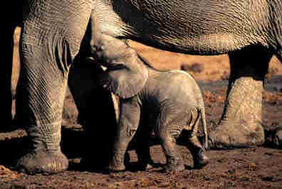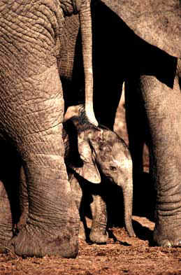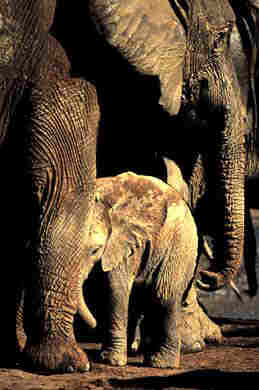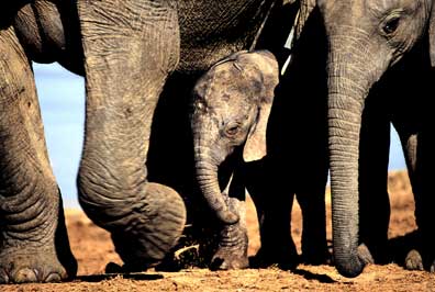 The first priority was to build a fence around the vest-pocket park - one that no elephant could push down. All efforts failed for many years, until the park's second warden, Graham Armstrong, devised a fence made of stout railway ties placed at short intervals and connected by rows of tramline and steel elevator cable. The second priority was to encourage the elephants to feel safe around people. Once again, an appeal was made to their stomachs. Tons of over-ripe oranges and vegetables were dumped in an open space and the elephants could not resist it. They became accustomed to visitors, but citrus fruit has had to be banned from the park, for some elephants will force a vehicle open to get at it. In the protected sanctuary of Addo Park, the elephants have quickly increased their numbers. I have always sought out the company of elephants from Northern Kenya down to Zimbabwe, and west to Namibia, but nothing prepared me for this sight. At a man-made waterhole, called Hapoor, tiny newborns struggled to keep up with the incoming and outgoing herds, lost in a forest of giant legs, tails and dust. They clung to the sides of their watchful mothers and were herded by their ever-vigilant older brothers and sisters. Confident youngsters, who had mastered the art of swinging a trunk and keeping their balance on stumpy legs, charged at birds or other elephant babies. But always they returned to stand in the shade under their mother's belly, or to slumber against her protective leg. Some even snoozed alongside my over-sized camper truck.